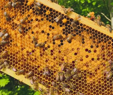 Nuo dešimtos paros lervos užima visą korio akį ir yra bičių darbininkių uždengiamos dangteliais (nuotraukoje matosi, kad dalis akių jau yra uždengtos, o kitose dar matomos lervutės).